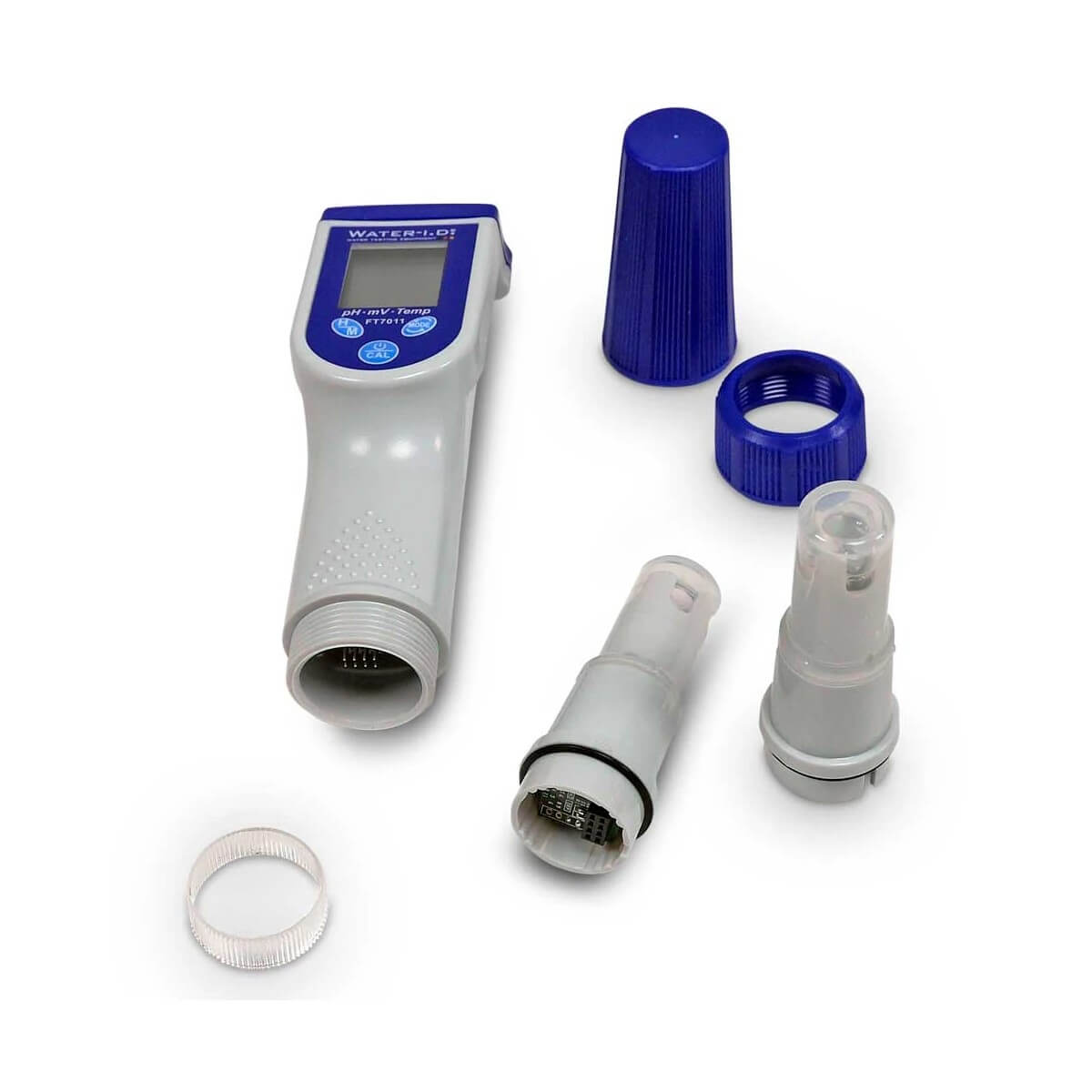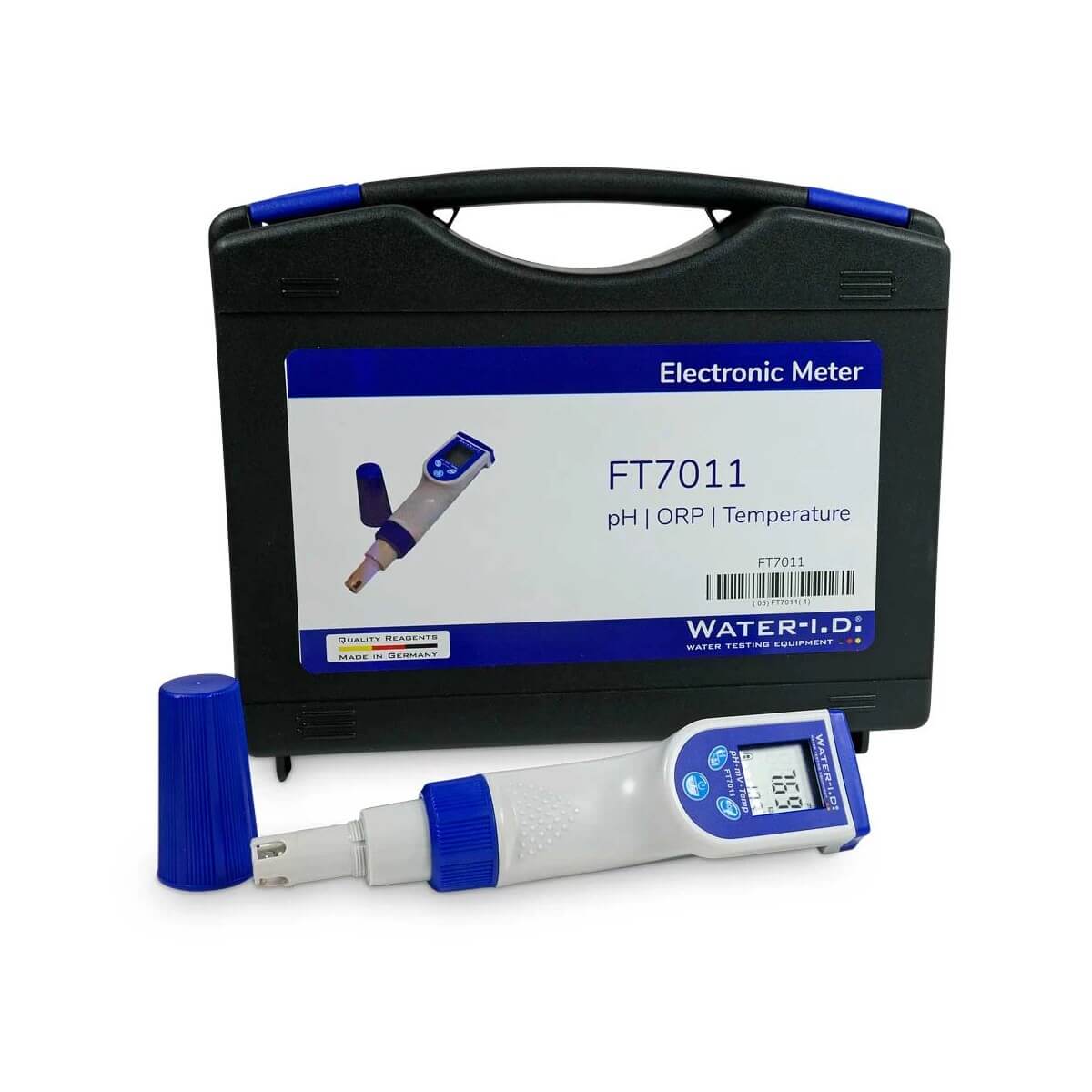 Elektronski merilnik pH-, ORP-(redoks) temperature Elektronski merilniki ponujajo popolnoma profesionalen način merjenja različnih vrednosti vode, kot so na primer prevodnost in pH-vrednost, brez potrebe po dodatnih reagentih (tabletah, kapljicah itd.). Ugotovljena vrednost se na napravi prikaže v nekaj sekundah po tem, ko jo potopite v vzorčno tekočino. Občutljive elektrode pa morajo biti vedno vlažne. Redno jih je treba kalibrirati z referenčno tekočino, po možnosti pred vsako meritvijo. Baterije in elektrode je mogoče zamenjati. Delovno območje elektronskega merilnika je med 0 in 50 °C; odvisno od modela je mogoče temperaturo kompenzirati z določanjem izmerjene vrednosti.