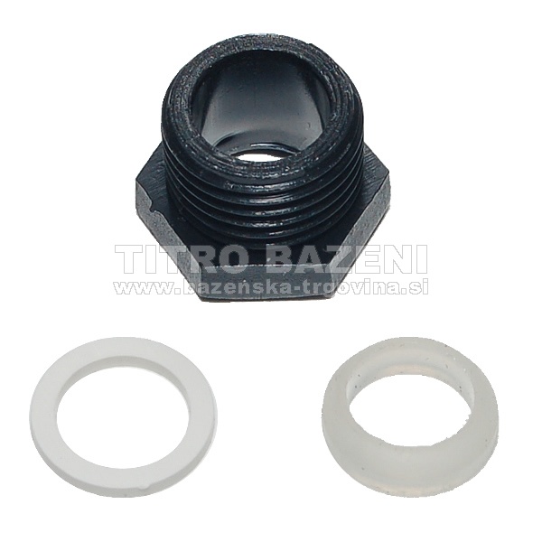 Tesnilna uvodnica za napajalni kabel 50 W podvodnega reflektorja ASTRAL z navojem in matico (brez ohišja). Komplet je sestavljen iz matice skozi katero gre kabel in tesnili.