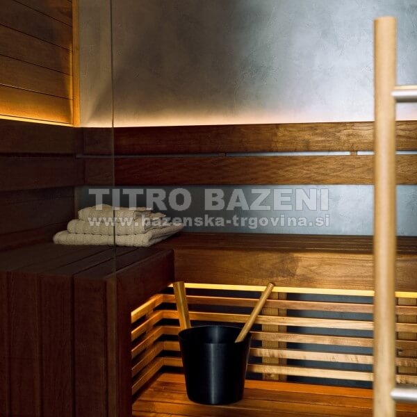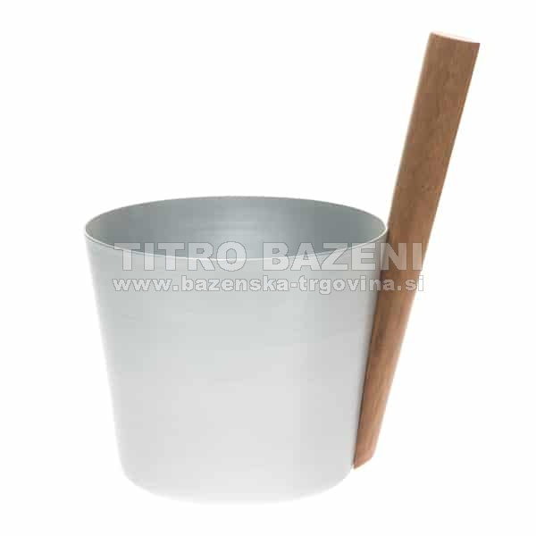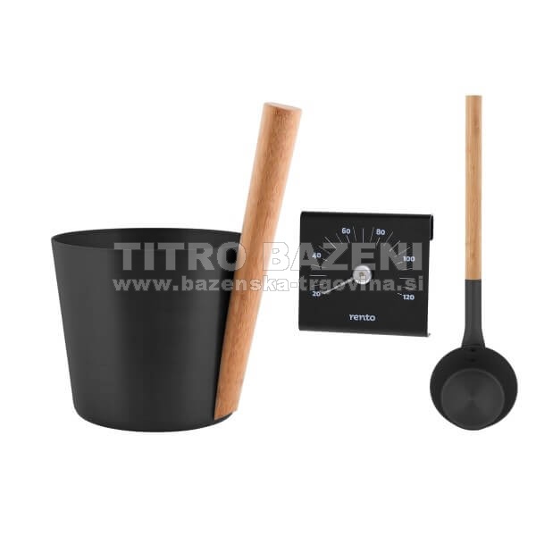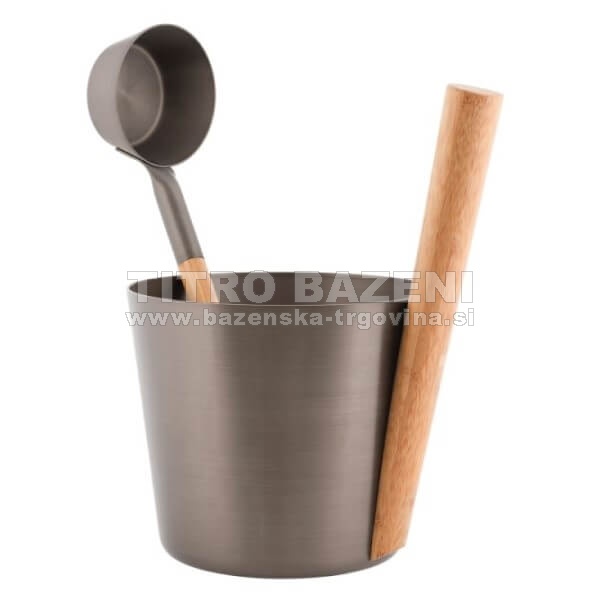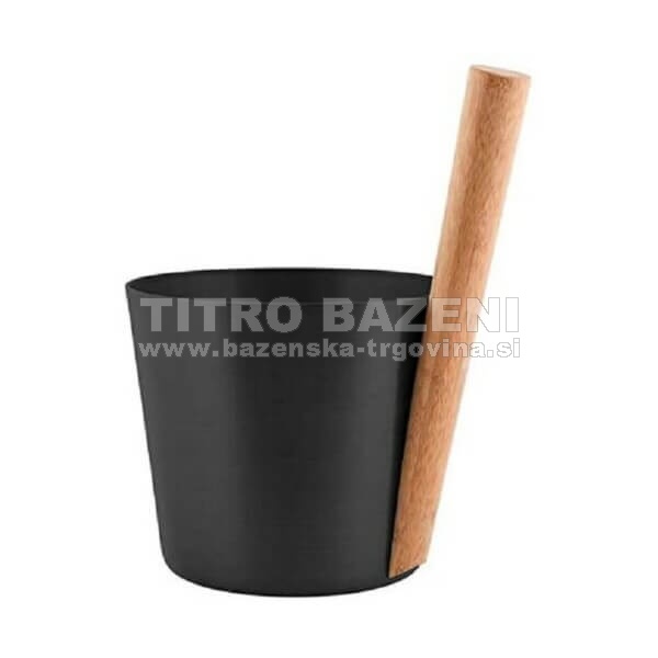 Eleganten čebriček za savno Rento v kombinaciji s toplotno obdelanim bambusom in anodiziranim aluminijem.
