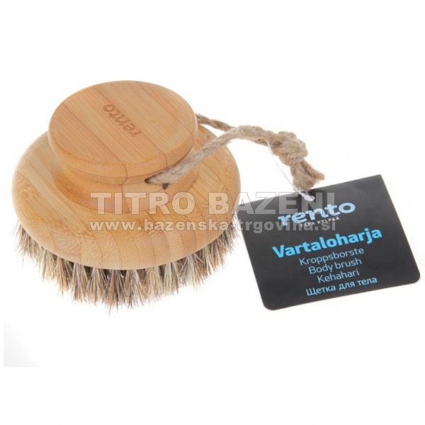 Okrogla krtača z lesenim prijemalom namenjena uporabi v savni.