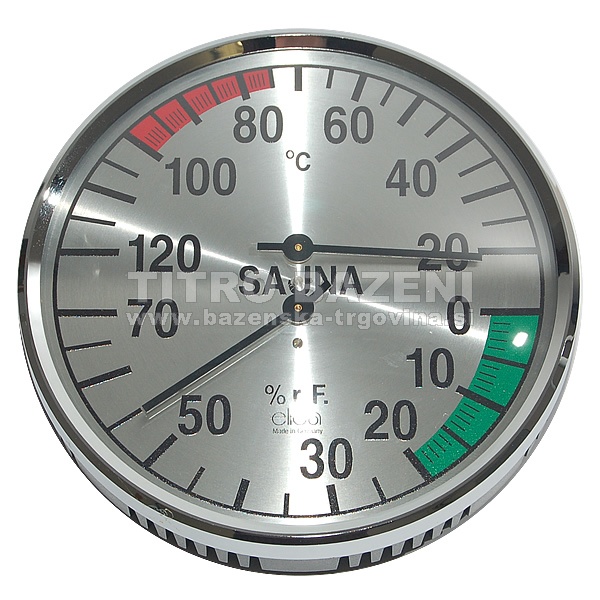 HIGROMETER-TERMOMETER v okroglem ponikljanem okvirju s kazalci za merjenje temperature in vlage v savni. Enostavna pritrditev na podlago. Nemški proizvod.