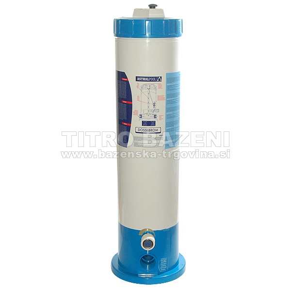 Dozator za klorove ali bromove tablete - Astral. Za enostavno regulacijo doziranja dezinfekcijskega sredstva ima dozator regulacijski gumb. Najbolje je, da je nameščen na by-pas na ceveh v bazen, tako lahko določate pretok vode skozi dozator. Ima dodaten regulator za fino nastavitev doziranja.