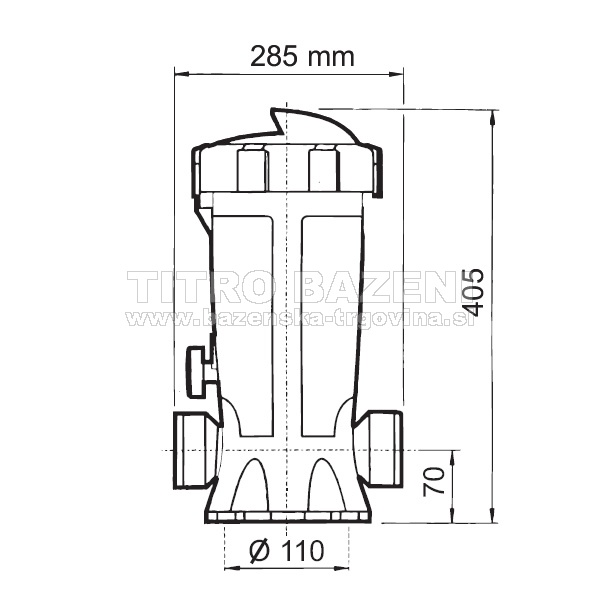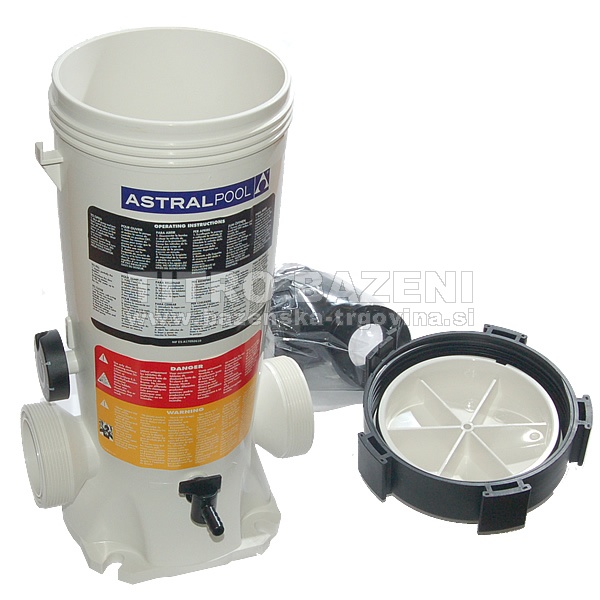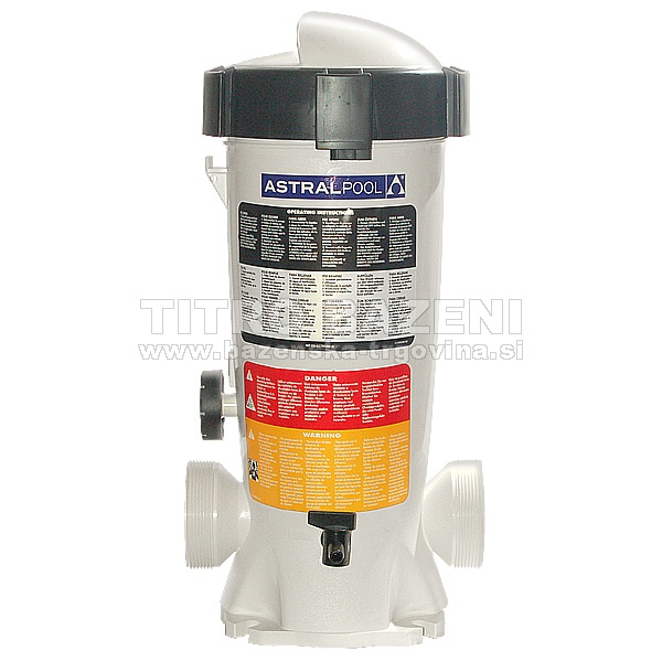 Dozator za klorove ali bromove tablete - Astral. Za enostavno regulacijo doziranja dezinfekcijskega sredstva ima dozator regulacijski gumb. Najbolje je, da je nameščen na by-pass na ceveh v bazen, tako lahko določate pretok vode skozi dozator. Ima dodaten regulator za fino nastavitev doziranja.