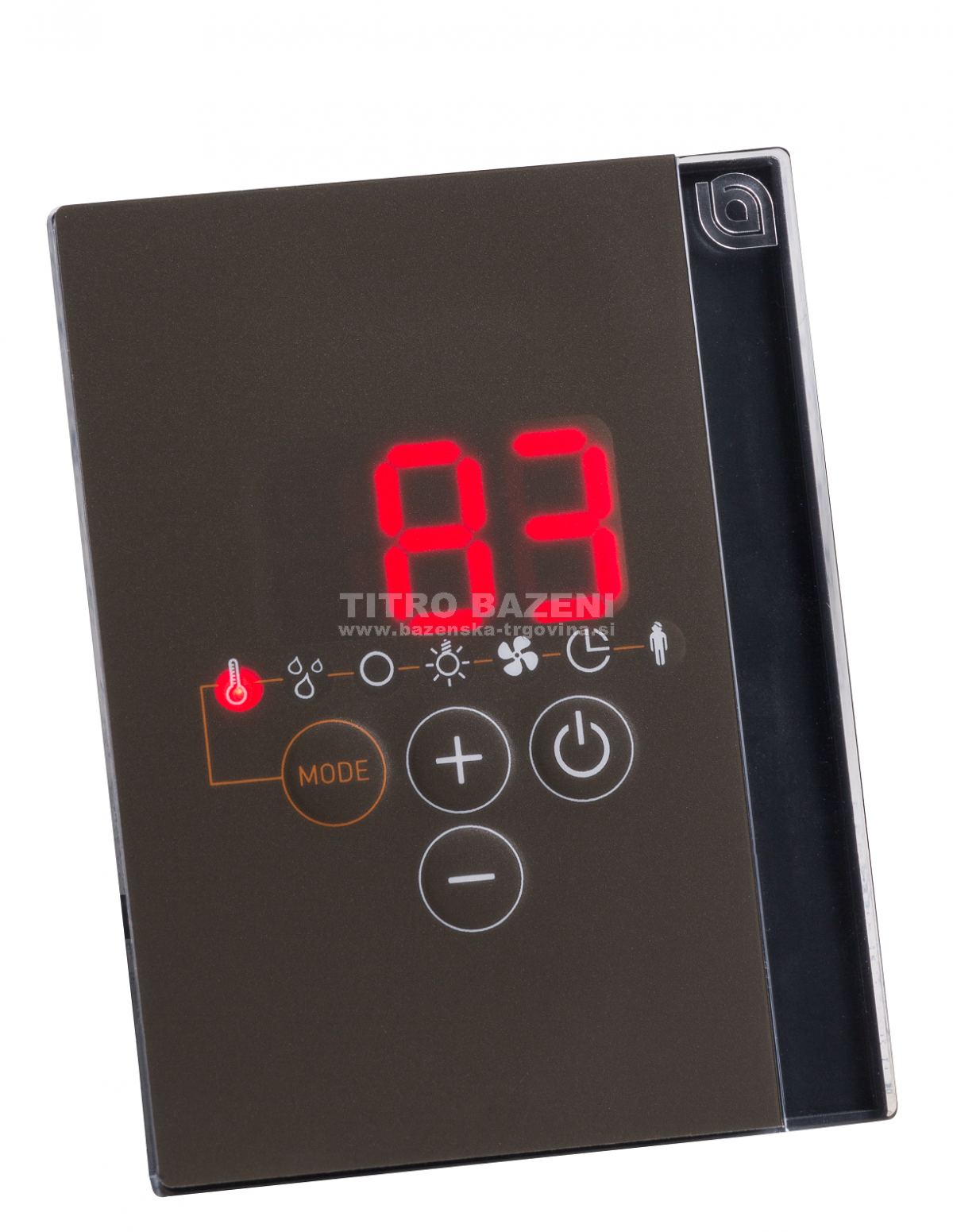Elegantna oblika digitalne nadzorne kontrolne plošče Sentiotec PRO-D3I z LED zaslonom in "soft touch" gumbi za kombinirane savne omogoča upravljanje številnih električnih naprav v savni, ne le peči.