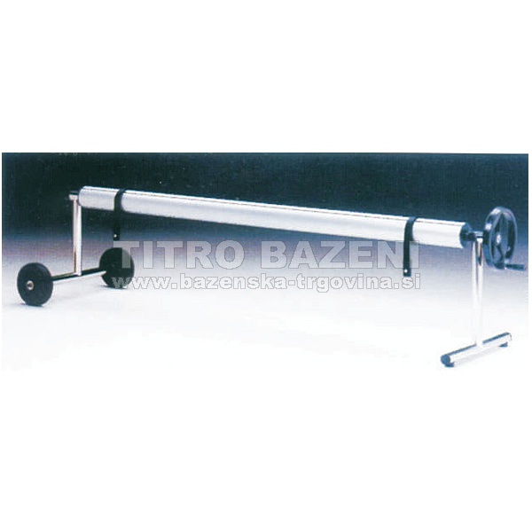PREMIČEN navijalec za termo pokrivalo s prilagodljivo dolžino od 5,0 do max. 6,5 m, je sestavljen iz teleskopske aluminijaste navijalne cevi in inox nosilci. Primeren je za širine pokrival od 4,8 do 6,3 m.