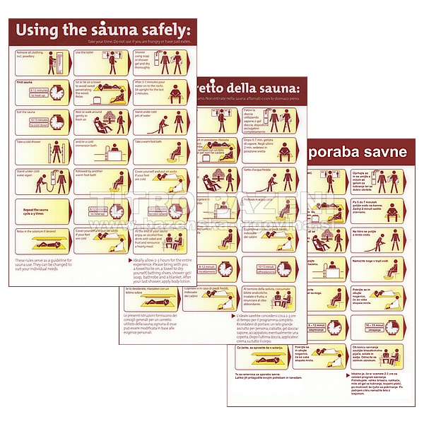 Nudimo plastificirana navodila velikosti A4, kjer je nazorno prikazan pravilen potek savnanja v finski savni.