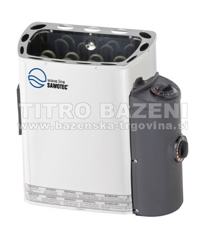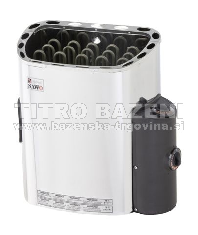 Peči za finske savne proizvajalca SAWO, vključno s termostatom in regulatorjem toplote na sami peči.