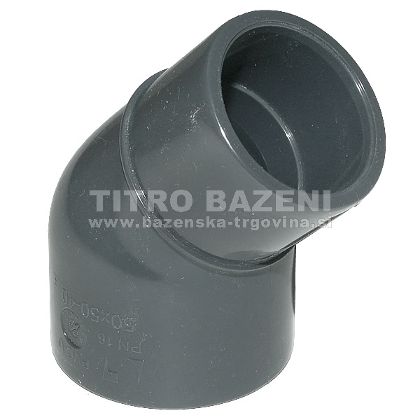 PVC koleno 45 stopinj, PN 16, z notranjim in zunanjim lepilnim priključkom. Omogoča hitrejšo izdelavo instalacij.