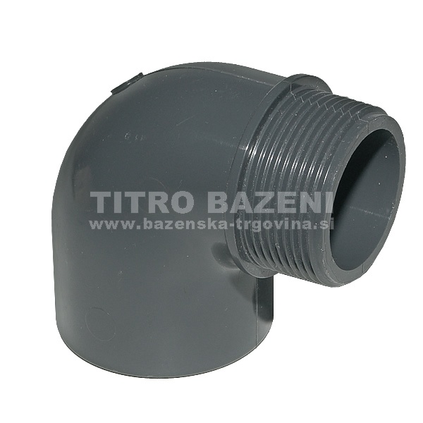 PVC koleno 90 stopinj, PN 16, z zunanjim navojem na eni strani, druga stran pa je standardna z lepilnim priključkom.