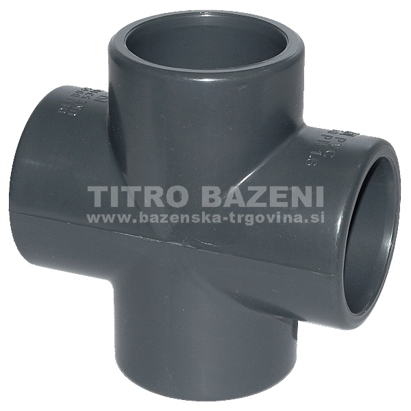 Standardni PVC križ z lepilnimi priključki. Uporaben povsod, kjer želimo cevovod razdeliti v 4 smeri. Na primer za izdelavo sesalnega kolektorja pred bazensko črpalko (1 x v črpalko in 3 x iz bazena - skimmer, dno, sesanje) in druge podobne primere.