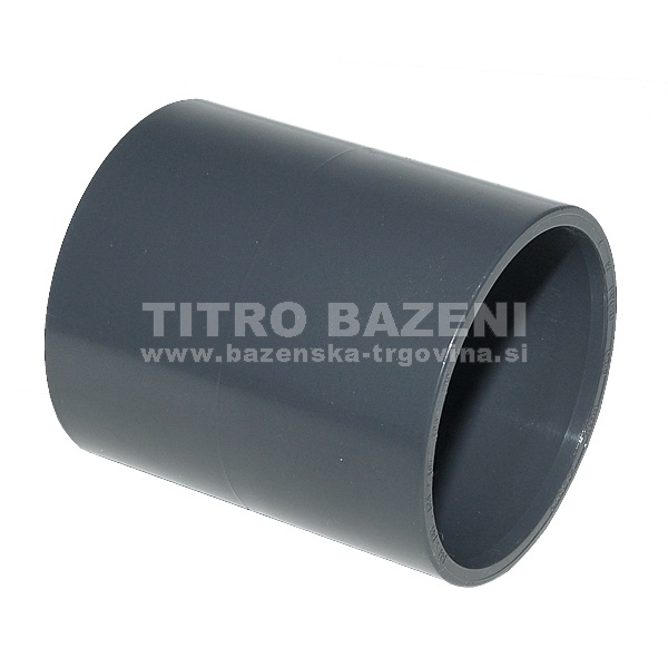 Standardno PVC lepilna spojka z obojestranskimi notranjimi lepilnimi priključki, uporabna za spajanje (sestavljanje) dveh PVC cevi.