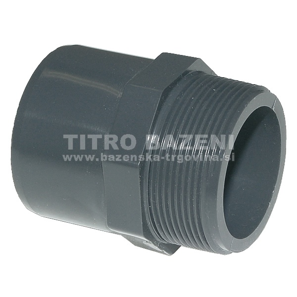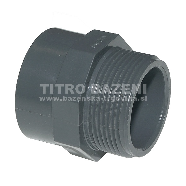 Reducirna PVC spojka z notranjim in zunanjim lepilnim priključkom, na drugi strani pa ima zunanji colski navoj.