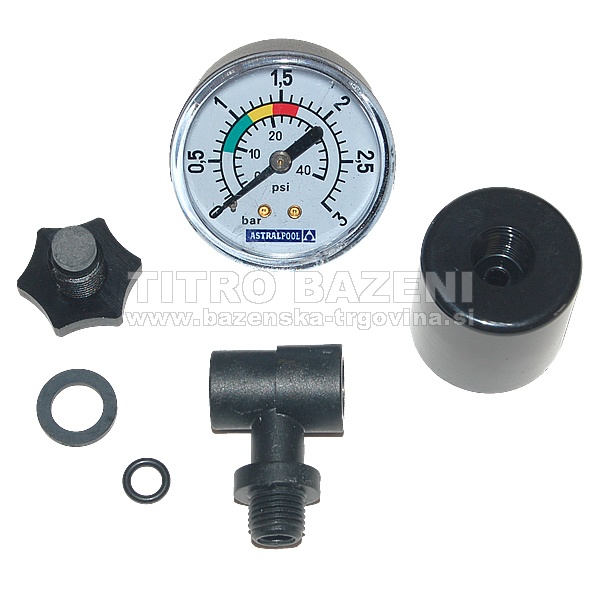 Kompletvsebuje: manometer, T-kos manometra z odzračevalnim ventilčkom in potrebimi tesnili , ter poseben nastavek za namestitev na zvezdast pokrov filtra.