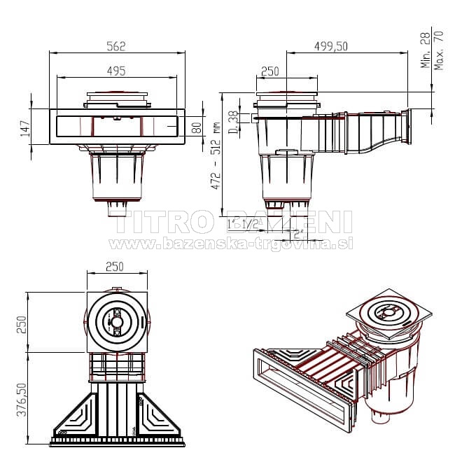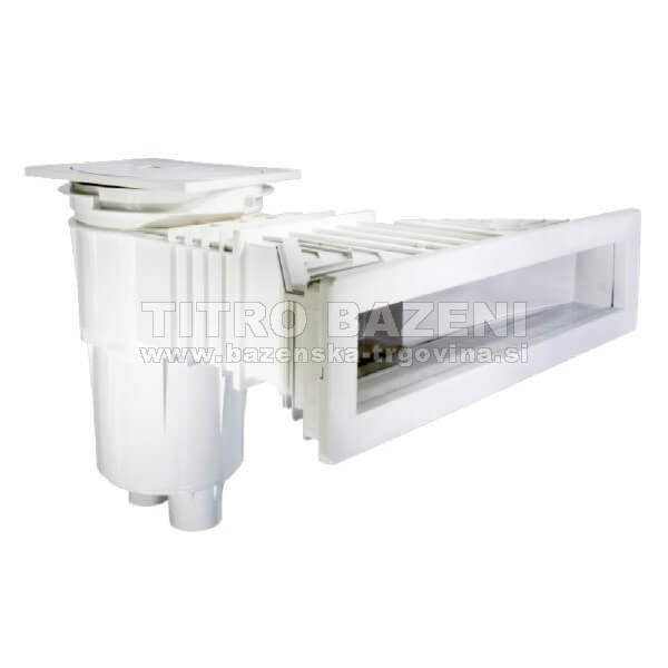 Na vsakih 25 m² vodne površine namestite en skimmer. Skimmer je primeren za priključke manjše od 1 ″ 1/2 in 2 ″ ter priključek za preliv vode Ø 40 mm.