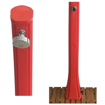 Solarni tuš narejen iz rdeče polietilenske cevi, narebrana z zgornje strani, opremljen z enoročno mešalno baterijo.